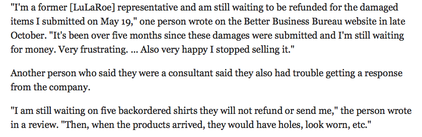 “Some representatives say it’s been getting harder to make money selling LuLaRoe because they are competing with so many more sellers now, and they have to run promotions to attract customers — which is a drain on profits.”