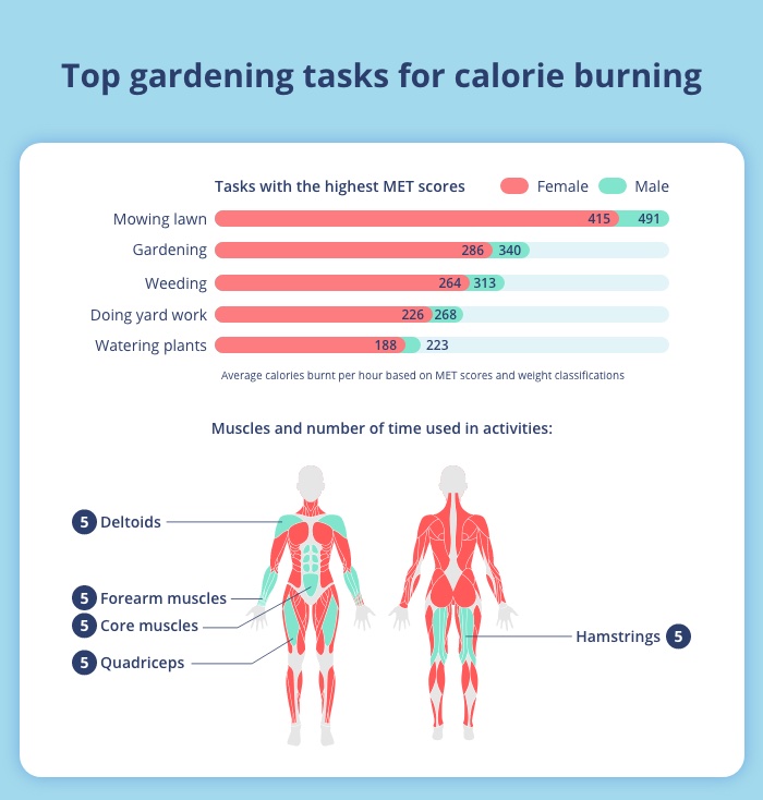 We found that the average man burns 313 calories per hour when weeding the garden, while the average woman burns 264 calories per hour.