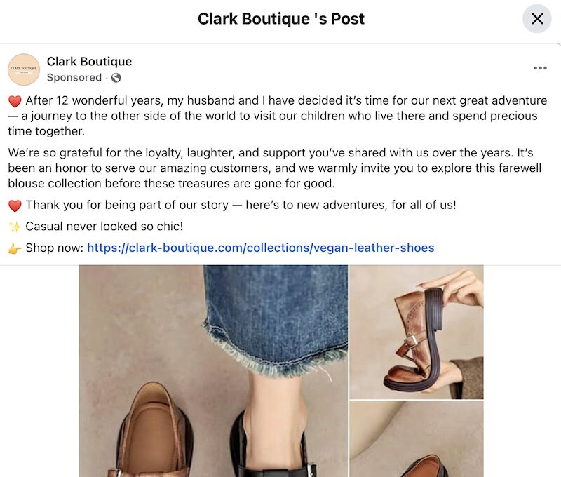 This is especially important if the Facebook ad lures you in with the classic ‘closing down’ sale story, as this website does: