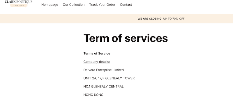 As you can see, they claim to be a British family-owned boutique, and even have a photo of the ‘owner’, Judith Clark outside their shop. But on their terms of service, they admit they are a Hong Kong-based company: