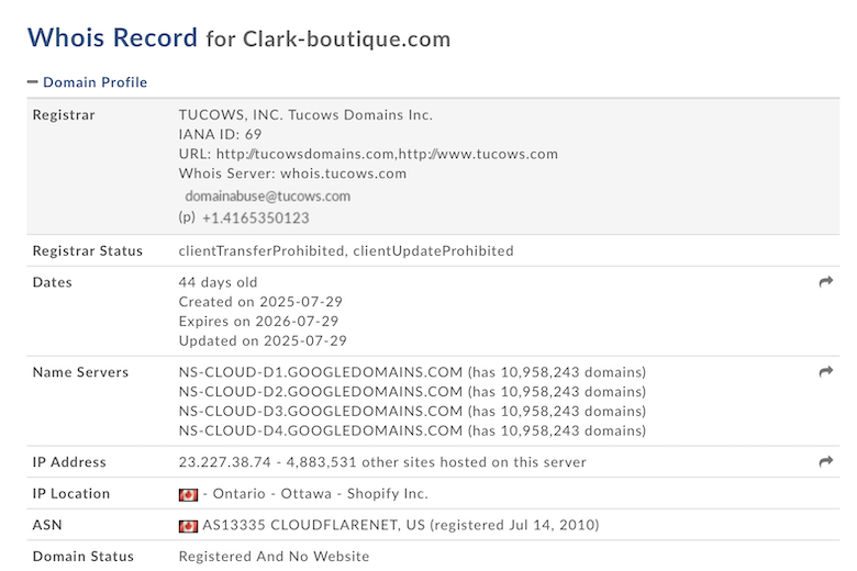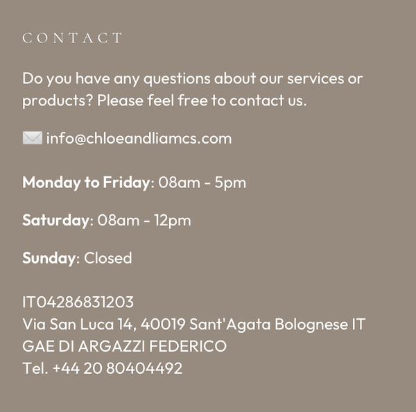 The website URL is wearchloe.com, but as you can see their email address is info@chloeandliamcs.com. This could be a lazy oversight, and they formerly were using the latter URL but it’s been penalised in some way so they have changed it, and forgot to update the email address on this website.