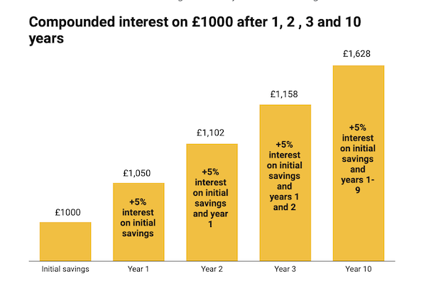 Because compound interest accumulates over time, it can turn a small amount of savings or investment into a significant amount. And the great thing about it is that it grows for you while you are living your life. You can forget about it, knowing that it is helping to increase your savings or pension.