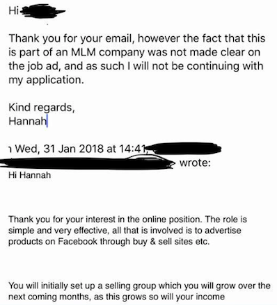 As we revealed recently, MLMs are fond of using legitimate job boards to try to recruit women as unpaid sales reps for their schemes. But, as blogger and social media expert Hannah Clarke discovered, they’re also actually passing off their ‘income opportunities’ as actual roles, listed with realistic-seeming recruitment agencies.
