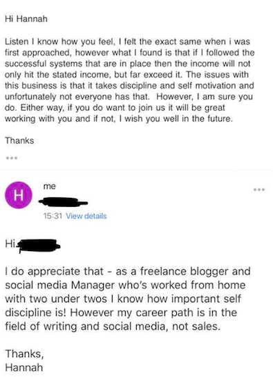 As you can expect, Hannah was disappointed and angry, and emailed the Kleeneze rep to let them know she didn’t wish to pursue the ‘opportunity’. Here’s the email exchange that followed:
