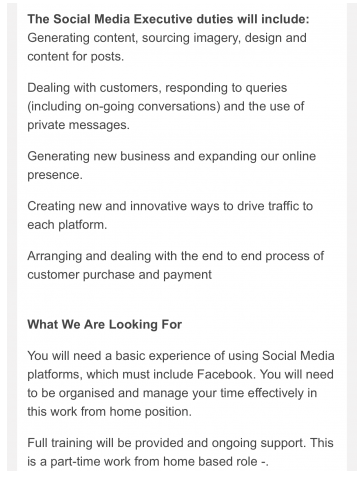 We searched for ‘social media executives’ roles on Total Jobs, just as Hannah had done, and applied for one of the many similar-sounding positions on page one of the search results with a fake CV. Here’s the description for the social media executive position we applied for: