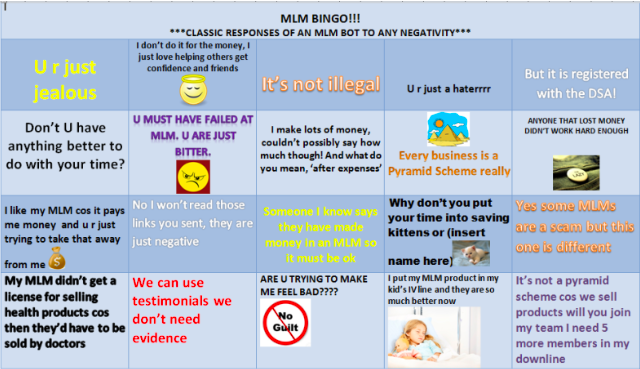 If anyone ever dares to question whether an MLM actually works, or whether an MLM rep’s quack doctor-esqe ads (or blatant boasts and lies) are true, they’ll usually get one of these responses. Sometimes you can fill an entire bingo card in one conversation!