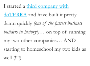 “You can share a product that you love from Thermomix to doTERRA, essential oils to make up to clothes and build a network marketing business. And you can do this online. I built one online. I was the fastest person in the world to build to doTERRA’s highest rank, um, just by doing and sharing online.”
