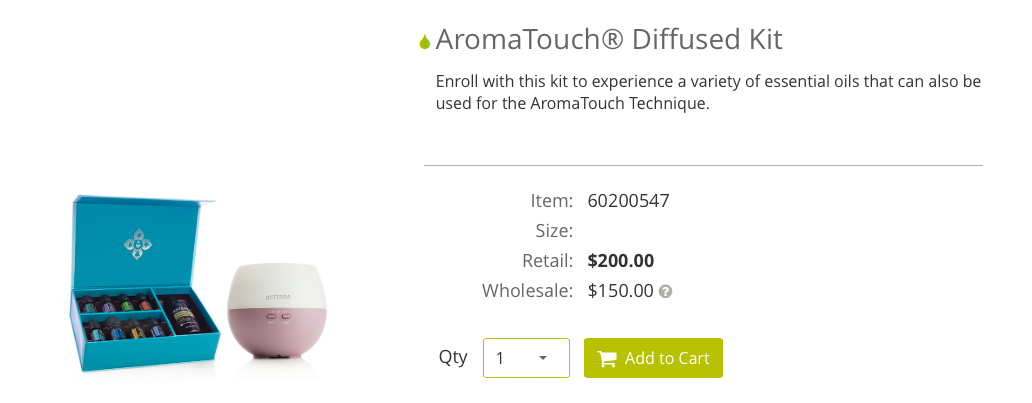 To demonstrate this, let’s investigate what you get in an AromaTouch® Diffused Kit from doTERRA: 8 x 5ml bottles of essential oils, 4ml of fractionated coconut oil and a diffuser for a total of US$200 (or $150 if you enrol).