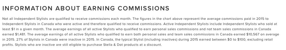 So how do these messages from the Stella&Dot website compare with their income disclosure statement? This is their 2015 income disclosure statement for Canada, taken from their website: