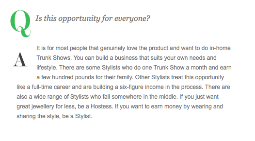 Let’s say you want a ‘flexible & rewarding part time career’ with an average monthly income of £715-£1,900. To earn £715 a month, using Stella&Dot’s own figures, you’d need to be above the top 3.7% of stylists. And to earn £1,900 a month you’d need to be above the top 1.1%.