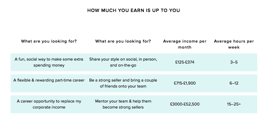And what if you want a ‘career opportunity’ to replace your corporate income and earn £3,000-£52,000 a month? To earn £3,000 a month you’d need to be above the top 0.5% of stylists. And to earn £52,000 a month you’d need to be off the table.