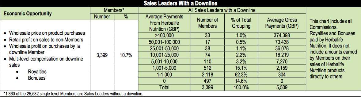 “For the 10.7% of Herbalife Nutrition Members who are Sales Leaders with a downline, the average compensation received from the Company in 2017 was (GBP) 5,509. These amounts are before expenses incurred in the operation or promotion of their business.”