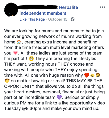 One popular target group for all MLMs, including Herbalife, is mothers. Given that Herbalife admit that 89% of their reps earned no commission from them in the UK in 2017, and that 76.9% of the few who DID earn money made less than £100 a month before expenses, we find posts like this below, currently being shared across Facebook by Herbalife reps, misleading and irresponsible: