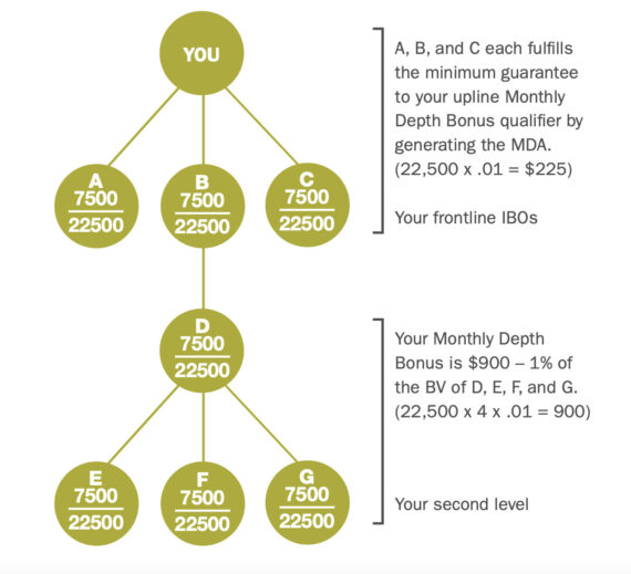 Here’s an example that demonstrates that the bonuses of people higher up the compensation plan depend on the sales (or purchases) of people below them: