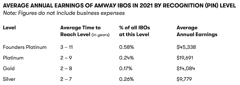 The Amway 2021 income disclosure statement also shows how many years it takes to reach levels in the company: