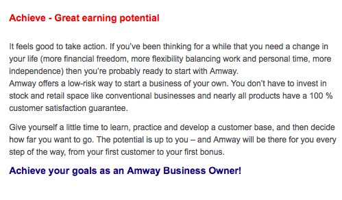 Now compare this information to the current recruitment marketing messages on Amway’s UK website: