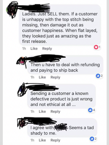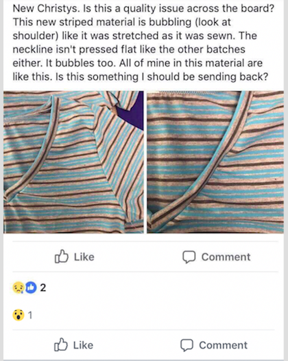 From spelling mistakes (villian, not villain) to missing seams, see through leggings and mismatching sleeves, there appear to be an increasing number of faults in LuLaRoe’s clothes. There seems to be such little confidence in the company’s damages policy that retailers are encouraged to actually sell these faulty clothes as usual, and hope customers don’t notice.