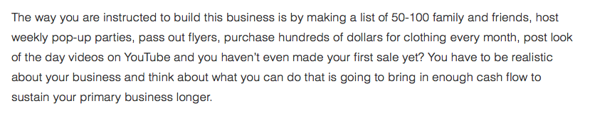 So you’re looking at around US$6,000 to set up as a LuLaRoe consultant. And it doesn’t stop there. According to this recruitment website you need to spend “hundreds of dollars” a month to build a business: