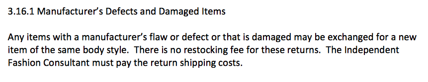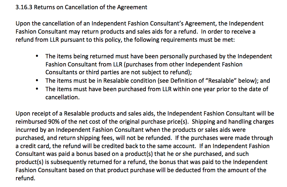 But in September 2017, LuLaRoe’s policy changed overnight to refund just 90% of the net costs of purchases made in the last 12 months only (subject to them meeting LuLaRoe’s strict policy requirements), less shipping: