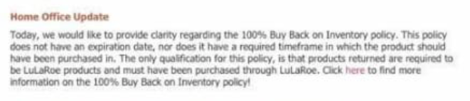 “In April, a policy was implemented stating that LuLaRoe consultants who were going out of business (or leaving the program) could return unsold merchandise to the company and receive a 100 percent refund at any time. Consultants were even covered for the cost of shipping and handling.”