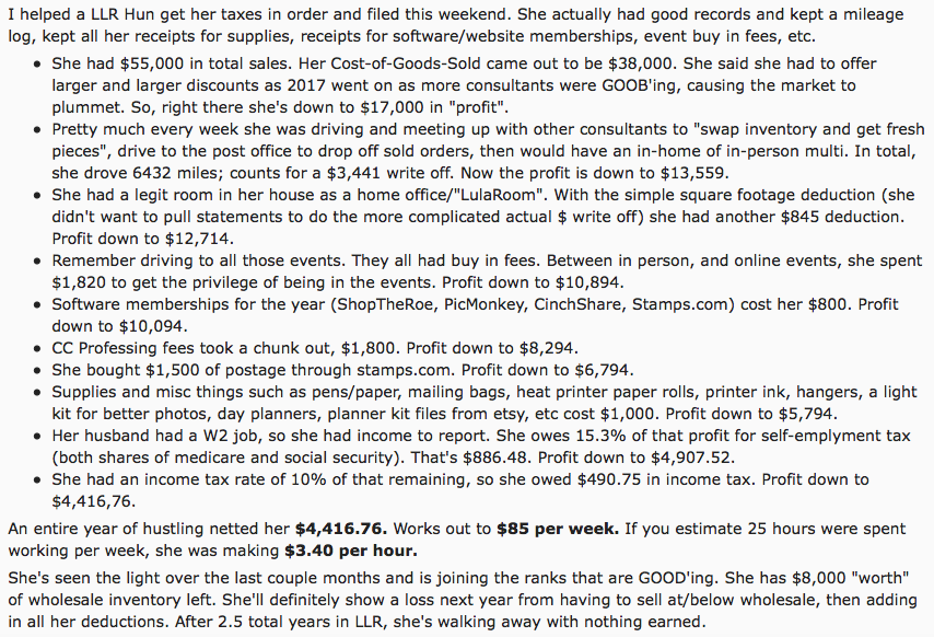 And remember, this is apparently sales income, not profit. Out of this sum, consultants need to deduct their expenses, including the cost of purchasing the stock from LuLaRoe.
