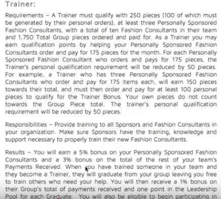 At trainer rank, you need 250 pieces to qualify for LuLaRoe bonus payments (100 of which need to be from your own personal order). You also need to have at least three personally sponsored fashion consultants under you, with a total of 10 fashion consultants in their team. And those 10 consultants need to order 1,750 pieces every month between them for you to receive your bonus: