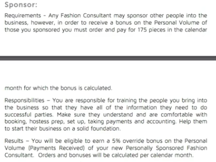 So if you’re a sponsor and you want to get commission on the purchases of any consultant you recruit into LuLaRoe you need to order 175 pieces every month. If, in any given month, you fail to order 175 pieces you receive no bonus payment.