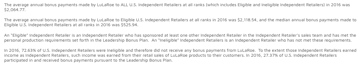 Bonus payments are based on “bonus payments made by LuLaRoe to Independent Retailers based on the sales generated by their teams.” They don’t include retail profits earned by the consultant themselves.