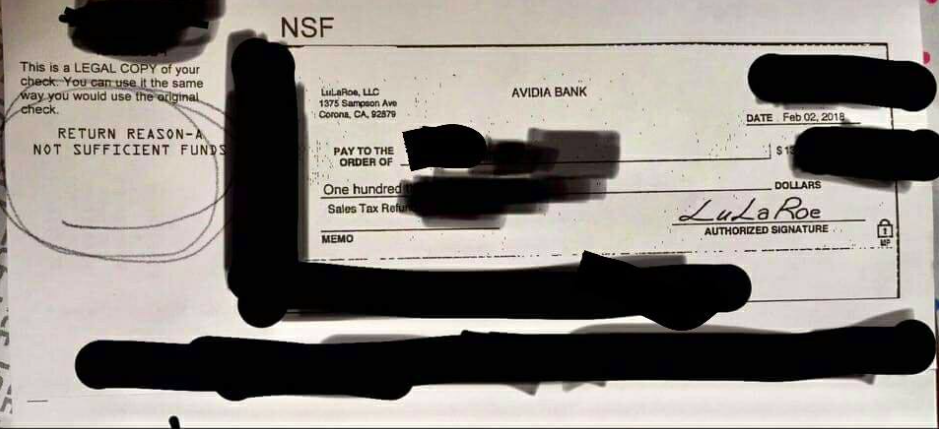 Here’s an photo of an alleged cheque for a tax refund from LuLaRoe to one of their consultants. As you can see, the cheque was returned as there were insufficient funds in the account.