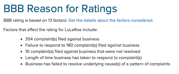 Given all the above, it’s no surprise that the US’ Better Business Bureau (BBB) has now rated LuLaRoe an F (it’s lowest rating) and states that the business is not accredited:
