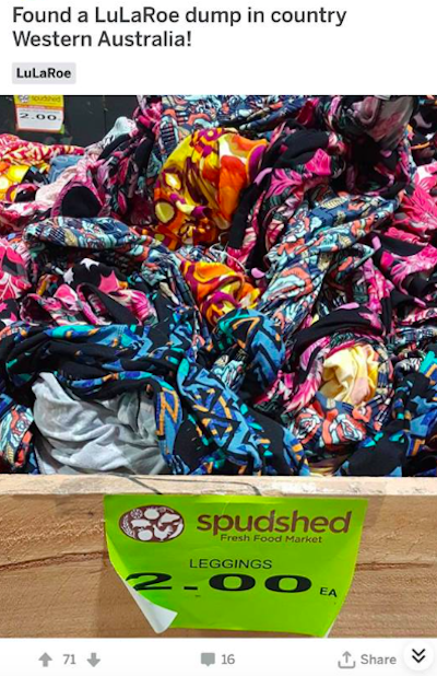 For a number of months now we’ve seen posts showing new LuLaRoe products for sale in discount stores across the US. Now it appears that it’s also being sold in bulk in a number of stores in Australia too, as this image of a pile of leggings for sale at just $2 a pair shows: