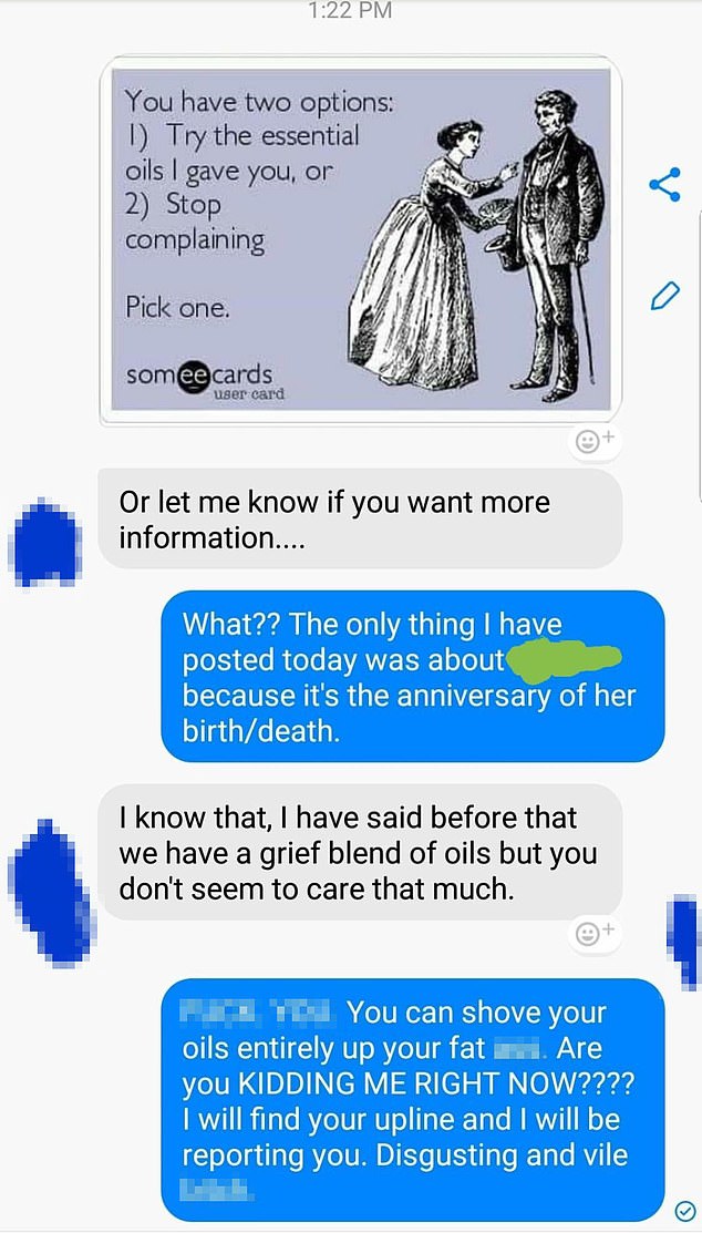 Not only are essential oil reps seemingly happy to make false health claims about their products (despite those warnings from the FDA), but they’re also quite comfortable peddling them to mothers of dead children: