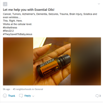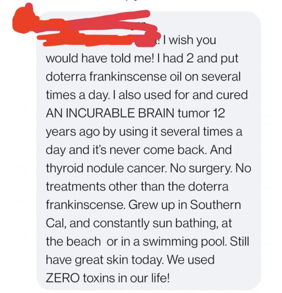 And, incredibly, here’s a post from a doTERRA rep claiming her oils cured an “incurable brain tumour”:
