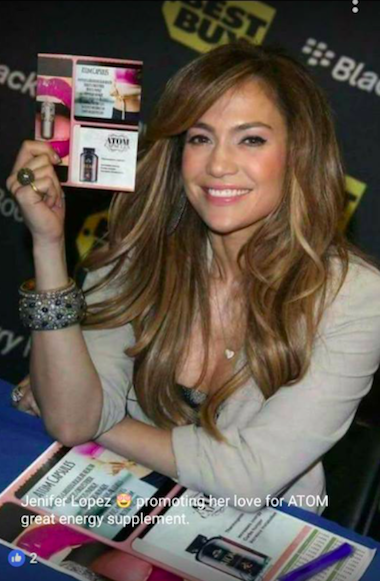Here’s another photo, this time of Jennifer Lopez apparently posing with marketing material from the MLM Vida Divina: