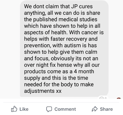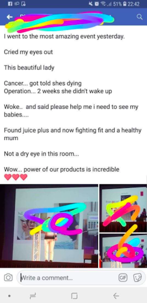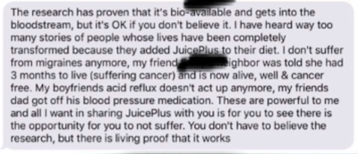This message goes even further, suggesting that Juice Plus+ cured their friend’s neighbour’s terminal cancer:
