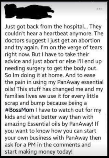 It turns out, using sympathy to sell and recruit is a bit of an MLM theme. Here’s another post sadly reporting a miscarriage, and pivoting alarmingly quickly to a business pitch: