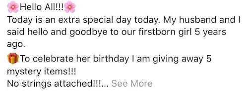 Yes, to ‘celebrate’ the birthday of their dead daughter, this rep is excitedly giving away mystery items. We can’t actually comment on this post further, as words fail us.