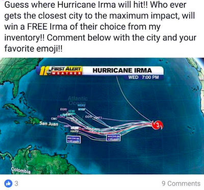 Remember Hurricane Irma? It his the US in September 2017 and caused significant destruction and a reported 134 deaths. But while hundreds of thousands of people were waiting for it to hit to find out if they would lose their home (or even life), this LuLaRoe rep saw the perfect opportunity to hold a fun contest: