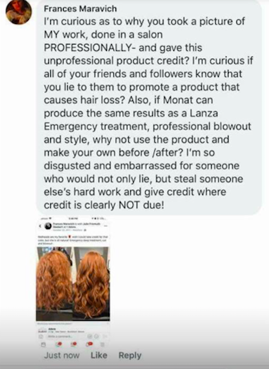 She’s not the only MONAT rep to be caught out lying. Not only are they seemingly fond of borrowing photos, but they’ve also been exposed for posting false claims of FDA approval, according to this news story. There are also a shocking amount of news stories and law suits regarding the damage MONAT is seemingly doing (including alleged hair breakage, sores, severe hormonal problems, depression and even, horrifyingly, permanent baldness).