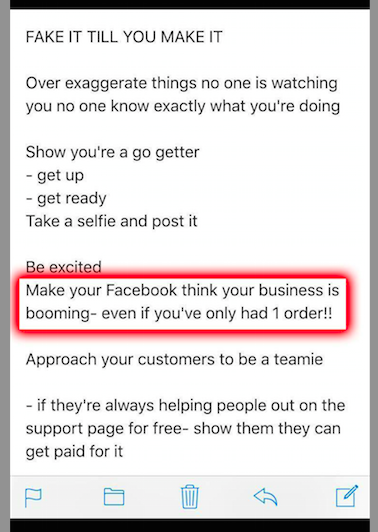 In this Facebook post, a former Juice Plus+ rep reveals that she was told to “fake it till I make it” and put fake order posts on Facebook so people thought she was doing well: