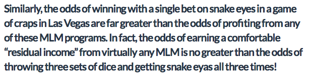 - “Of 1,000 people who join an MLM, 996 will lose money after subtracting expenses”