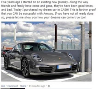 Here’s another post from a rep, this time boasting about the Porsche they bought in cash with Amway: