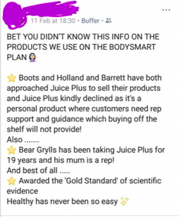 MLM reps’ wild claims don’t stop with false representations of their material gains and pretending they’re the happiest woman in the world (even if they’re weeping into their eye shadow palette); they’re also very happy fabricating claims that make it look like their products are legitimate and in demand. Here’s a Facebook post from a Juice Plus+ rep: