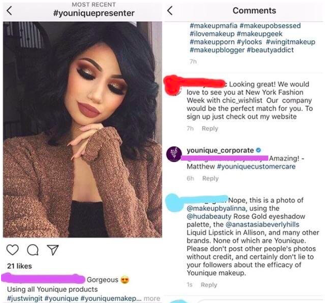 We recently revealed how little you can earn with MLM Younique. Here’s one of their presenters caught out lying about a photo of a famous makeup artist (who has not apparently used any ANY Younique products):