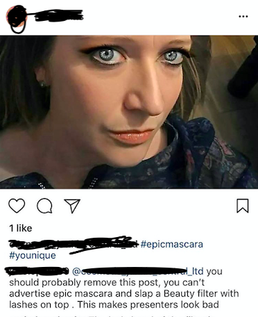 Here’s another Younique presenter caught adding a filter with fake lashes on it to a photo and trying to claim it’s Younique mascara: