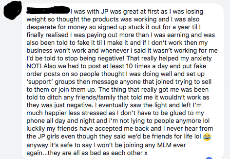 “When I was with Herbalife they’d always tell us to go onto new/struggling reps posts and comment as if we were customers/prospective customers (“I love this shake it gives me everything I need for the day!”/“wow this sounds awesome, can I have more info please?”) – all so fake and obvious!