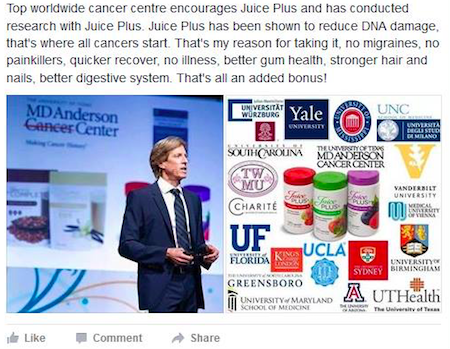 Young Living and doTERRA are far from the only reps guilty of wild claims. As we covered extensively here, Juice Plus+ reps have also been caught out lying that a renowned cancer centre ‘encouraged’ their products and that they were “shown to reduce DNA damage” where “all cancers start”: