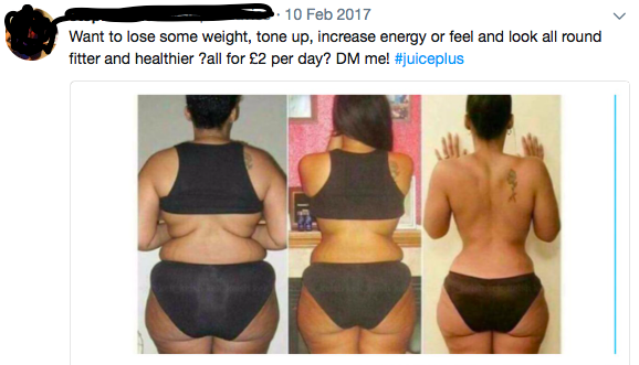 And here’s another Juice Plus+ rep on Twitter, insinuating these photos are the result of Juice Plus+, rather than the truth (they’re photos of this woman who lost weight through old-fashioned healthy eating and exercise):