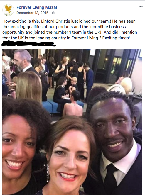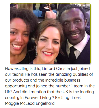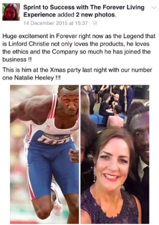 A rep for MLM Forever Living went one step further, claiming that Gold medal-winning Olympic champion Linford Christie OBE had actually joined her team on her website and on Facebook: