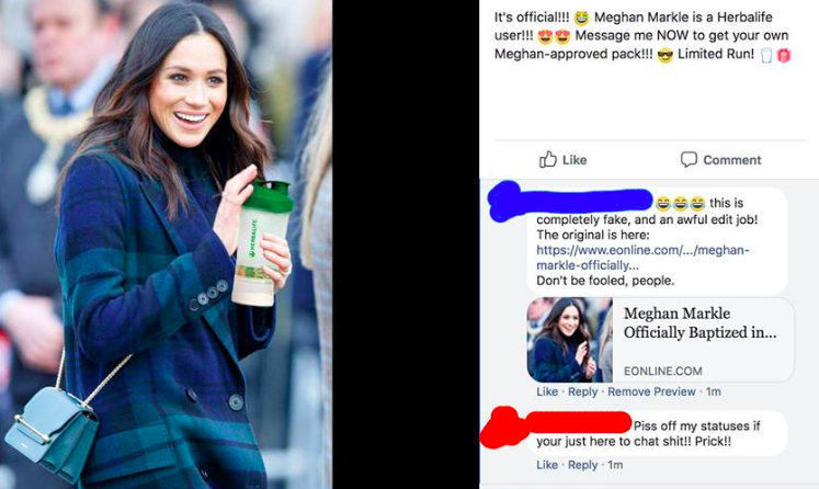 It didn’t take long for MLM reps to attempt to cash in on the royal wedding between Prince Harry and Meghan Markle. Here’s a badly retouched photo of Meghan apparently clutching a Herbalife drink (only you can clearly see from the real photo in the comments that she wasn’t…):